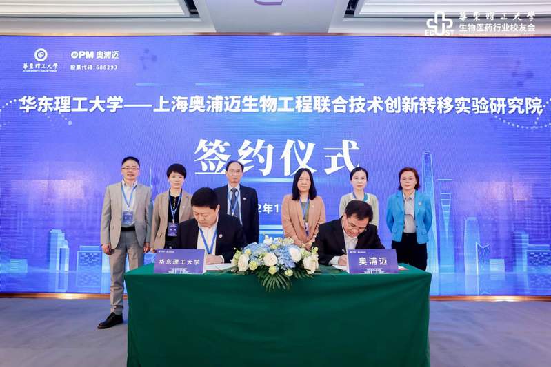 論壇上還舉行了華東理工大學(xué)與上海奧浦邁生物科技股份有限公司關(guān)于科研合作簽約儀式。根據(jù)協(xié)議,雙方將充分發(fā)揮各自資源優(yōu)勢(shì),聯(lián)合組建“華東理工大學(xué)—上海奧浦邁生物工程聯(lián)合技術(shù)創(chuàng)新轉(zhuǎn)移研究院”,在優(yōu)勢(shì)互補(bǔ)、互惠互利的原則上,探索實(shí)踐產(chǎn)教融合發(fā)展模式,持續(xù)推動(dòng)科技成果轉(zhuǎn)化與專業(yè)人才培養(yǎng)。華東理工大學(xué)科學(xué)技術(shù)發(fā)展研究院院長(zhǎng)、國(guó)家技術(shù)轉(zhuǎn)移中心主任趙黎明,上海奧浦邁生物科技股份有限公司董事長(zhǎng)肖志華校友代表校企雙方簽約。