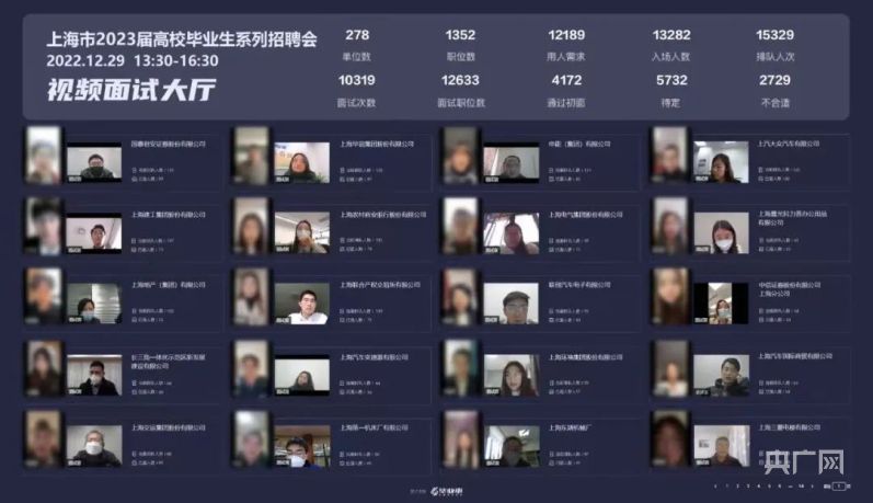 29日下午,上海電氣、華誼集團、申能集團、上海建工、國泰君安、長三角投資公司等知名企業(yè)紛紛派出面試小組登錄云端面試間,同時開展人才洽談工作,278家企業(yè)共發(fā)布12189個用人需求,吸引了1.3萬名畢業(yè)生進場,1.5萬人次排隊,4172人次通過初面。
