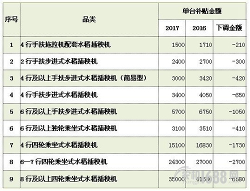 其三,單臺(tái)補(bǔ)貼額度下調(diào)。從2017年插秧機(jī)單臺(tái)補(bǔ)貼金額看,各個(gè)機(jī)型呈現(xiàn)普遍下調(diào)的特點(diǎn)。下降均幅在10%以上,最高的達(dá)到16%。補(bǔ)貼額度下調(diào),對(duì)部分潛在用戶(hù)產(chǎn)生較大影響,進(jìn)而影響整體市場(chǎng)需求。