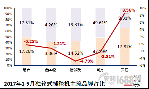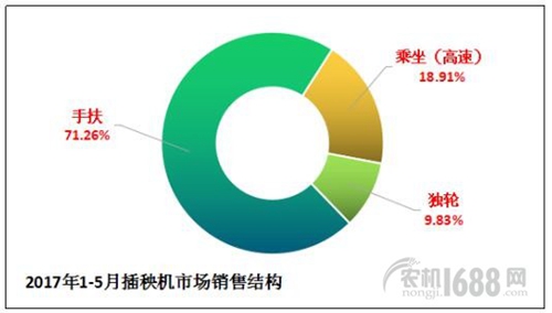 2017年1-5月份,插秧機(jī)市場(chǎng)在各種利好因素支撐下,呈現(xiàn)穩(wěn)健運(yùn)行、小幅攀升的發(fā)展特點(diǎn),成為主流市場(chǎng)中的唯一亮點(diǎn)。市場(chǎng)調(diào)查顯示,截至5月底,累計(jì)銷(xiāo)售各種插秧機(jī)8.74萬(wàn)臺(tái),同比小幅攀升3.27%。其中,手扶插秧機(jī)累計(jì)銷(xiāo)售6.23萬(wàn)臺(tái),同比增長(zhǎng)4.81%;乘坐(高速)插秧機(jī)累計(jì)銷(xiāo)售1.65萬(wàn)臺(tái),同比大幅度攀升10.42%;獨(dú)輪式插秧機(jī)出現(xiàn)較大幅度滑坡,累計(jì)銷(xiāo)售0.86萬(wàn)臺(tái),同比下滑16.15%。從占比看,手扶、乘坐(高速)、獨(dú)輪式分別占71.26%、18.91%和9.83%,較之2016年同期增長(zhǎng)1.05%、1.23%和-2.28%。