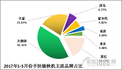 乘坐式插秧機(jī)市場(chǎng)主要控制在久保田、洋馬和井關(guān)三大品牌之手,市場(chǎng)調(diào)查顯示,2017年前5個(gè)月這三家企業(yè)累計(jì)銷(xiāo)售1.39萬(wàn)臺(tái)乘坐式插秧機(jī),同比增長(zhǎng)14.54%;占比83.85%,較之2016年同期上揚(yáng)3.01個(gè)百分點(diǎn)。