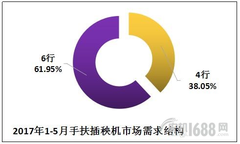 近年,我國(guó)手扶插秧機(jī)市場(chǎng)向多行發(fā)展的勢(shì)頭十分強(qiáng)烈,2行機(jī)基本退出市場(chǎng),4行機(jī)逐年式微。2017年前5個(gè)月,這種趨勢(shì)更加突出。市場(chǎng)調(diào)查顯示,截至5月底,累計(jì)銷(xiāo)售4行機(jī)2.37萬(wàn)臺(tái),6行機(jī)3.86萬(wàn)臺(tái),同比分別增長(zhǎng)-30.05%和53.12%;占比分別為38.05%和61.95%。