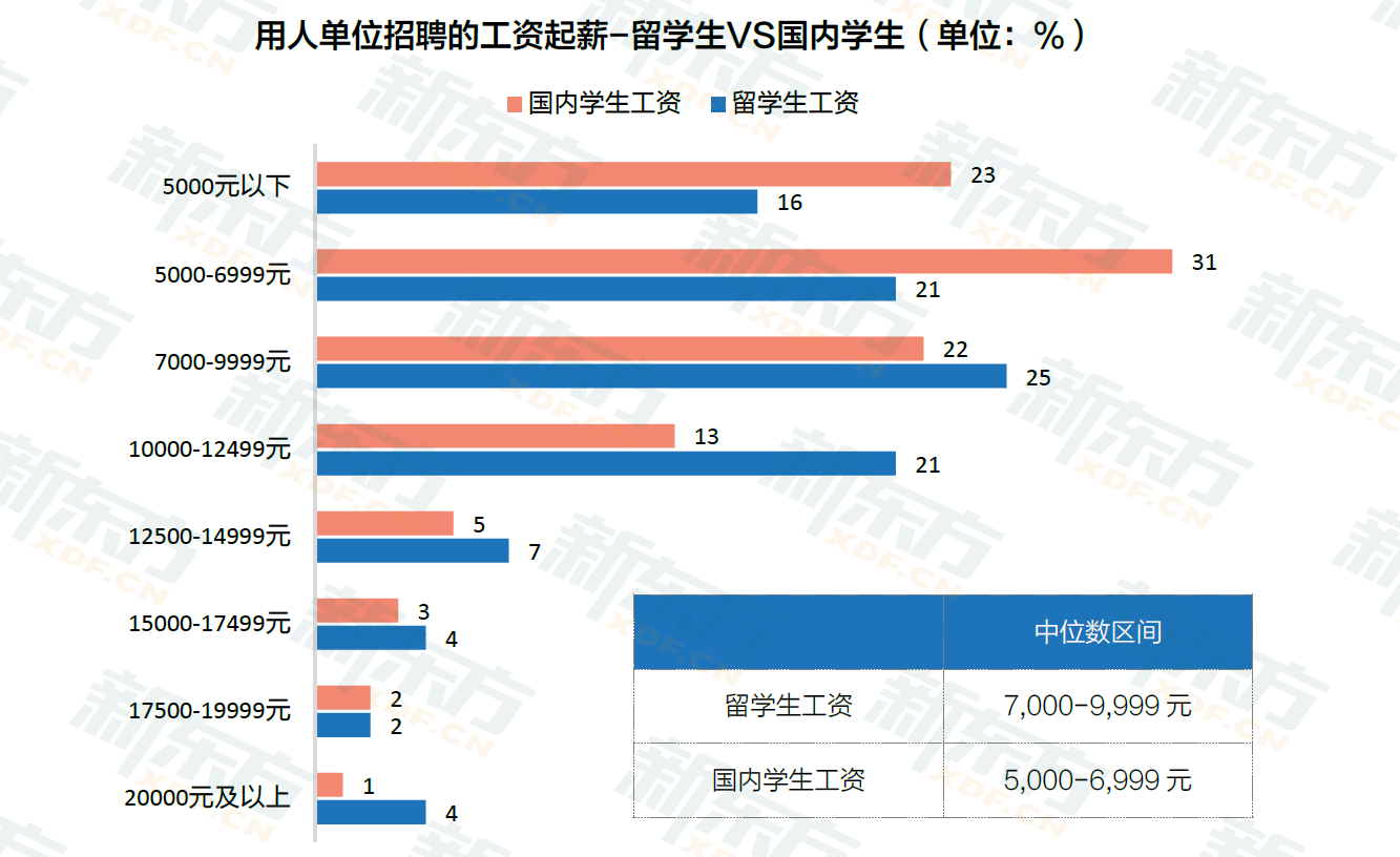 近幾年來,在國內(nèi)良好的經(jīng)濟發(fā)展勢頭和優(yōu)厚的人才福利政策之下,留學生紛紛選擇歸國就業(yè)。根據(jù)2023年調(diào)研數(shù)據(jù),留學生起薪普遍高于國內(nèi)高校畢業(yè)生。此外,留學生工資的中位數(shù)區(qū)間位于7,000-9,999元,而國內(nèi)學生的中位數(shù)區(qū)間位于5,000-6,999元。整體而言,用人單位在招募國內(nèi)外高校畢業(yè)生時,更加認可留學生在就業(yè)市場上的競爭力,也更愿意給他們支付更高的薪資。