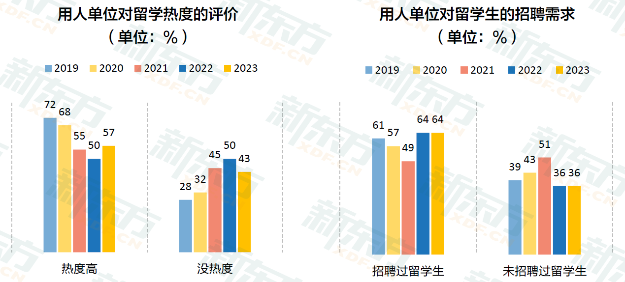 隨著全球疫情形勢的好轉(zhuǎn)及國內(nèi)的逐步開放,用人單位對留學熱度的評價有所回升,認為當前留學熱度較高的評價相比2022年增長了7個百分點。在2023年,用人單位對留學生的招聘需求雖然與2022年一致,占比為64%,但整體數(shù)量呈現(xiàn)出上浮的趨勢。
