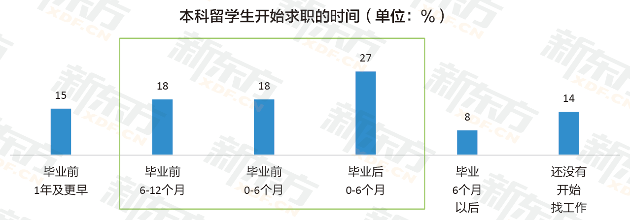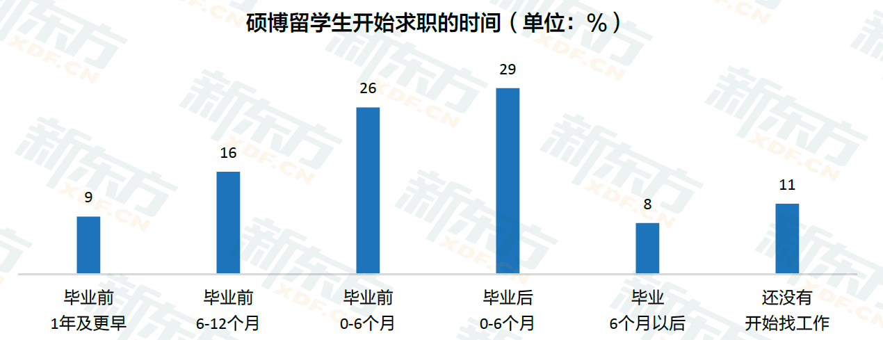 在目前的就業(yè)形勢下,本科留學生在求職時的準備時間較長,找工作的時間主要集中在畢業(yè)前6-12個月至畢業(yè)后6個月內(nèi)這段時期。碩博留學生對待求職的態(tài)度較為從容,更多人選擇在畢業(yè)前6個月開始籌備求職,不僅如此,近半數(shù)的碩博留學生在畢業(yè)后才開始考慮求職的問題。