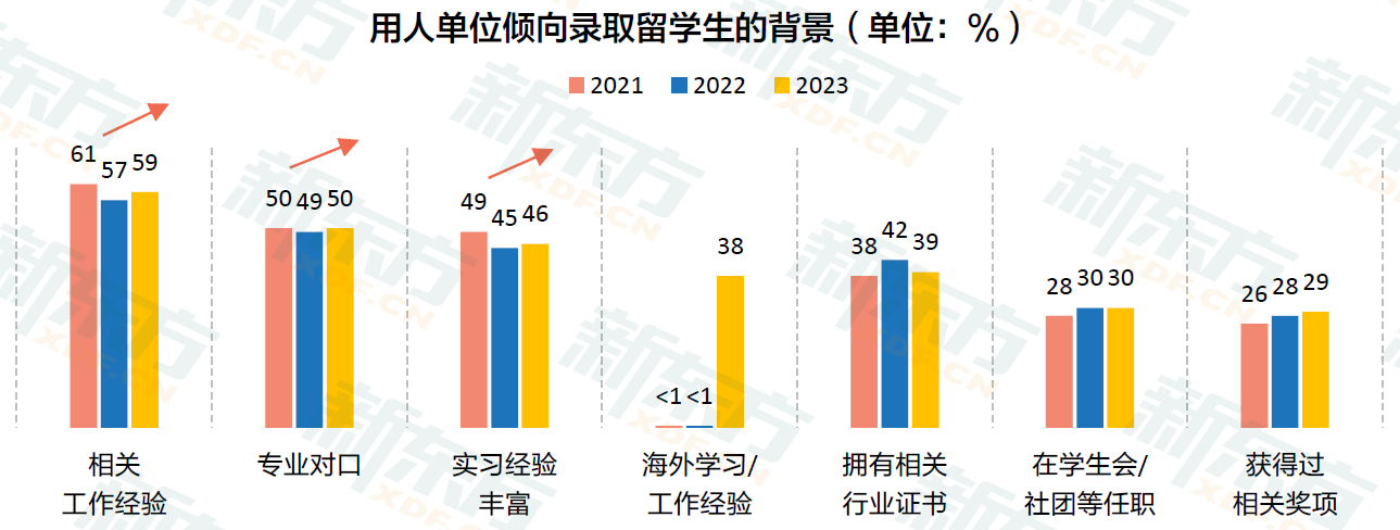 根據(jù)2023年調(diào)研數(shù)據(jù),當前本科留學生中有過實習經(jīng)歷的占比為43%,擁有實習經(jīng)歷的碩博留學生為61%,均較2022年有所下滑。與此同時,“相關(guān)工作經(jīng)驗”、“專業(yè)對口”和“實習經(jīng)驗豐富”依然是用人單位重點關(guān)注的留學生背景信息。出于對用人成本的考慮,用人單位更青睞具備以上這些素質(zhì)的留學生。建議學生們在留學過程中,也要重視積累相關(guān)實習和工作經(jīng)驗,為了今后長遠的職業(yè)發(fā)展打下基礎(chǔ)。