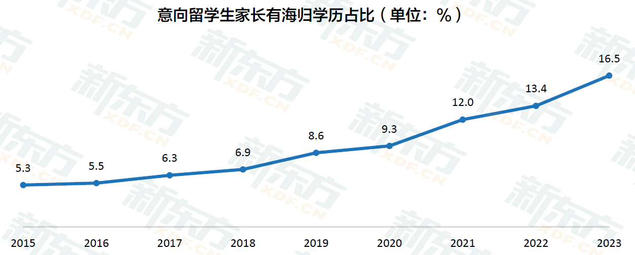 在2023年,擁有海歸學歷的意向留學生家長達16.5%,較2022年增長3.1%??梢姡?jīng)接受過海外教育經(jīng)歷的父母也更傾向于讓自己的孩子走出國門,接受國際教育,拓展國際視野。