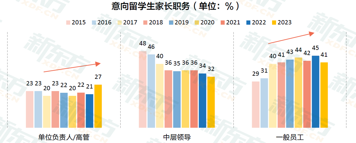 根據(jù)白皮書連續(xù)9年的調(diào)研數(shù)據(jù)顯示,意向留學生家長的職務(wù)為“一般員工”的家庭自2018年起成為了主要留學群體,并且占比持續(xù)攀升。這與國家經(jīng)濟的快速發(fā)展和人民生活水平的提升有著密不可分的關(guān)系,留學也從小眾選擇變得更加大眾化、常態(tài)化。