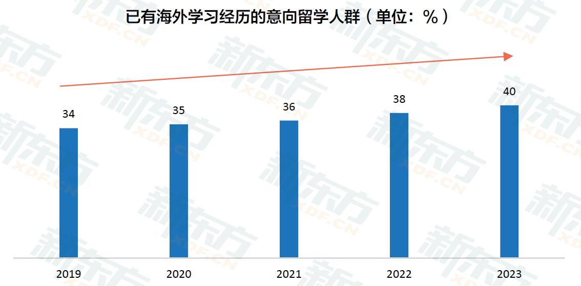 在2023年,意向留學人群中有過海外學習經(jīng)歷的占比達四成,近五年一直持續(xù)呈現(xiàn)出上升態(tài)勢。越來越多的學生選擇通過海外學習項目來豐富個人背景經(jīng)歷,為之后的留學申請以及未來的海外生活打下堅實的基礎(chǔ)。