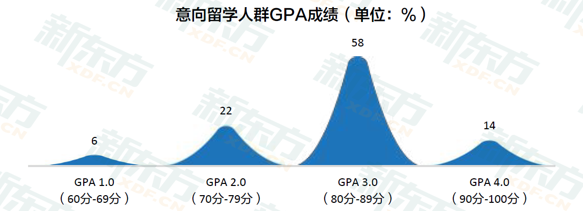 從意向留學人群的成績來看,72%的意向留學人群gpa成績達到了3.0及以上,成績優(yōu)異??梢姵煽兿鄬?yōu)異的學生的出國留學意愿強烈,也說明了申請的競爭日趨激烈。