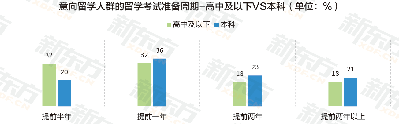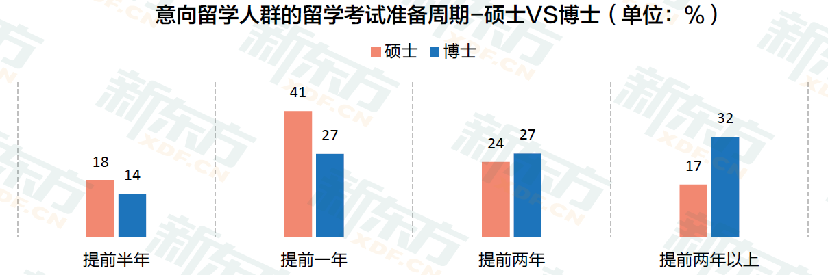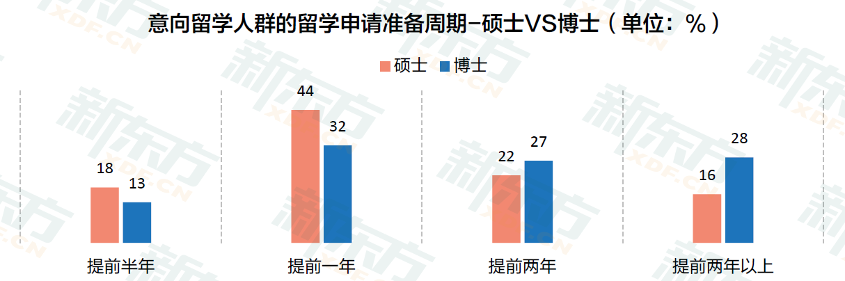 不論是對于留學考試還是留學申請的籌備,碩士意向留學人群普遍會選擇提前一年開始;而博士申請流程相對比較復(fù)雜且存在不確定性,對申請人的要求也比較高,因此希望出國讀博士的人群大多會提前兩年及以上開始準備,以期能獲得心儀的錄取。