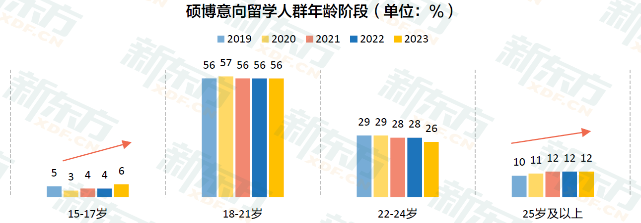 17歲及以下意向出國留學的人群呈上升態(tài)勢,25歲及以上意向出國讀碩博的人群日漸增多