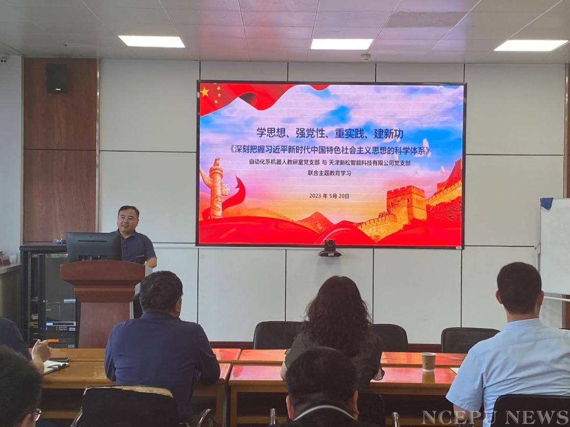 本網(wǎng)保定訊:為扎實(shí)推進(jìn)主題教育,強(qiáng)化理論學(xué)習(xí),全面深入貫徹習(xí)近平新時(shí)代中國特色社會(huì)主義思想和黨的二十大精神,5月20日下午,自動(dòng)化系機(jī)器人教研室黨支部與天津新松智能科技有限公司黨支部開展學(xué)習(xí)貫徹習(xí)近平新時(shí)代中國特色社會(huì)主義思想主題教育聯(lián)合學(xué)習(xí)活動(dòng)。自動(dòng)化系黨委書記嚴(yán)立,天津新松智能科技有限公司黨支部書記關(guān)騰、執(zhí)行董事舒?zhèn)ヒ约爸Р奎h員、機(jī)器人教研室黨支部黨員同志參加活動(dòng)?;顒?dòng)由機(jī)器人教研室黨支部書記苑朝主持。