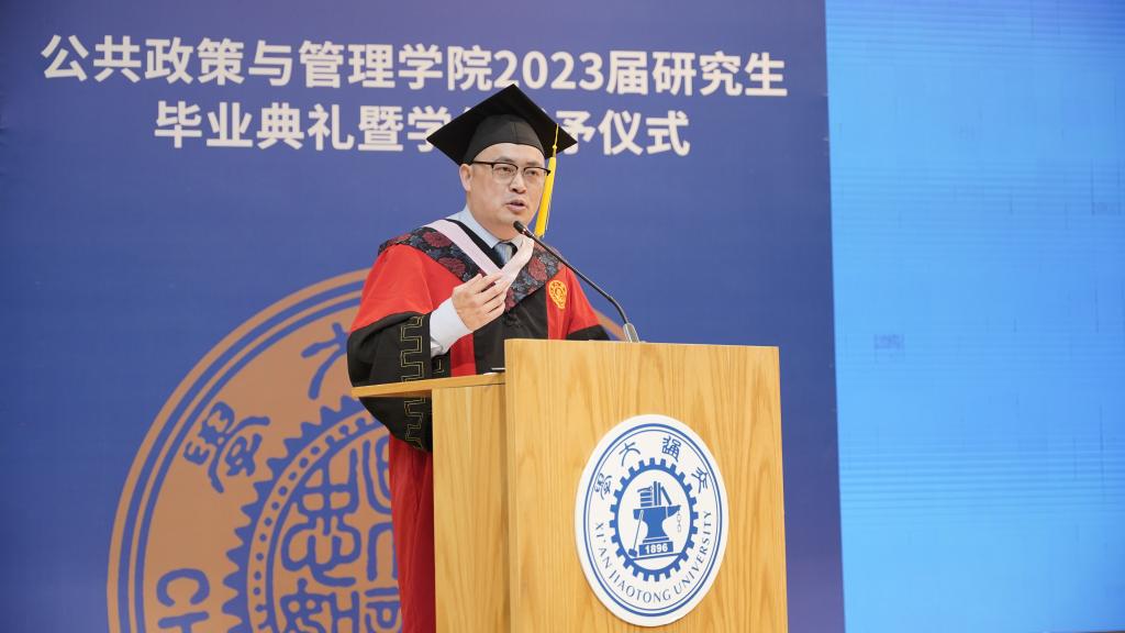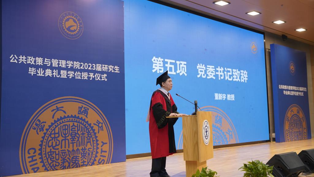 公管學(xué)院黨委書記董新宇致辭,他回首2023屆畢業(yè)生學(xué)習(xí)的崢嶸歲月,為全體畢業(yè)生們所取得的成果感到驕傲;希望同學(xué)們能夠不負(fù)青春、不負(fù)韶華、不負(fù)時(shí)代,勇敢擁抱新的機(jī)遇與挑戰(zhàn),從公管學(xué)院揚(yáng)帆起航,在各自未來的人生道路上回報(bào)社會(huì),回饋交大,共建更美好的交大!