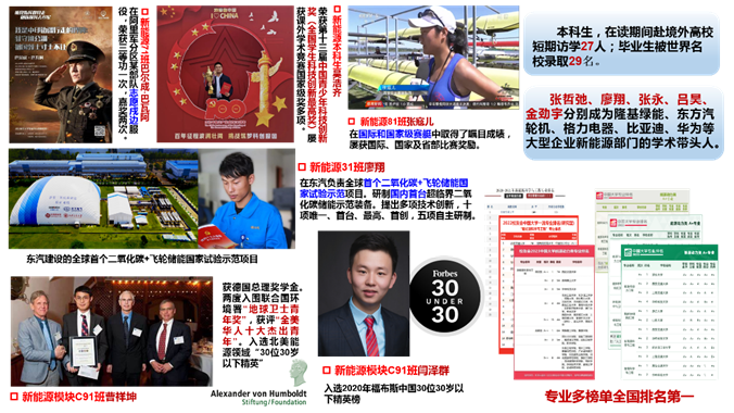 其中,吳浩齊(本碩貫通培養(yǎng))帶領(lǐng)團隊首創(chuàng)氣磁結(jié)合的顛覆性霧化技術(shù),榮獲第十三屆中國青少年科技創(chuàng)新獎(全國學(xué)生科技創(chuàng)新最高獎,屢獲課外學(xué)術(shù)競賽國家級獎項;巴爾成·巴瓦阿在部隊志愿戍邊服役榮獲三等功;張寇兒屢獲國際級和國家級賽艇比賽獎勵;曹祥坤兩度入圍聯(lián)合國環(huán)境署“地球衛(wèi)士青年獎”,入選聯(lián)合國兒童基金會青年創(chuàng)變者,當選聯(lián)合國可持續(xù)發(fā)展解決方案網(wǎng)絡(luò)local pathways fellow,獲評“全美華人十大杰出青年”,獲“創(chuàng)造未來設(shè)計大賽”全球唯一特等獎;張哲弛現(xiàn)任隆基綠能全球企業(yè)發(fā)展與戰(zhàn)略總監(jiān),主要負責隆基在全球范圍內(nèi)的新技術(shù)、新業(yè)務(wù)、新商業(yè)模式等方面的戰(zhàn)略合作及投資并購項目;任宇勛赴香港科技大學(xué)攻讀博士學(xué)位期間解決新型質(zhì)子交換膜材料“卡脖子”問題,并于2022年獲得國家級項目資助;廖翔在東方汽輪機有限公司負責研制國內(nèi)首臺超臨界二氧化碳示范裝備,提出了多項技術(shù)創(chuàng)新,十項唯一、首臺、最高、首創(chuàng),五項自主研制。畢業(yè)生張永、呂昊、金勁宇等人分別成為格力電器、比亞迪、華為等大型企業(yè)新能源部門的學(xué)術(shù)帶頭人。