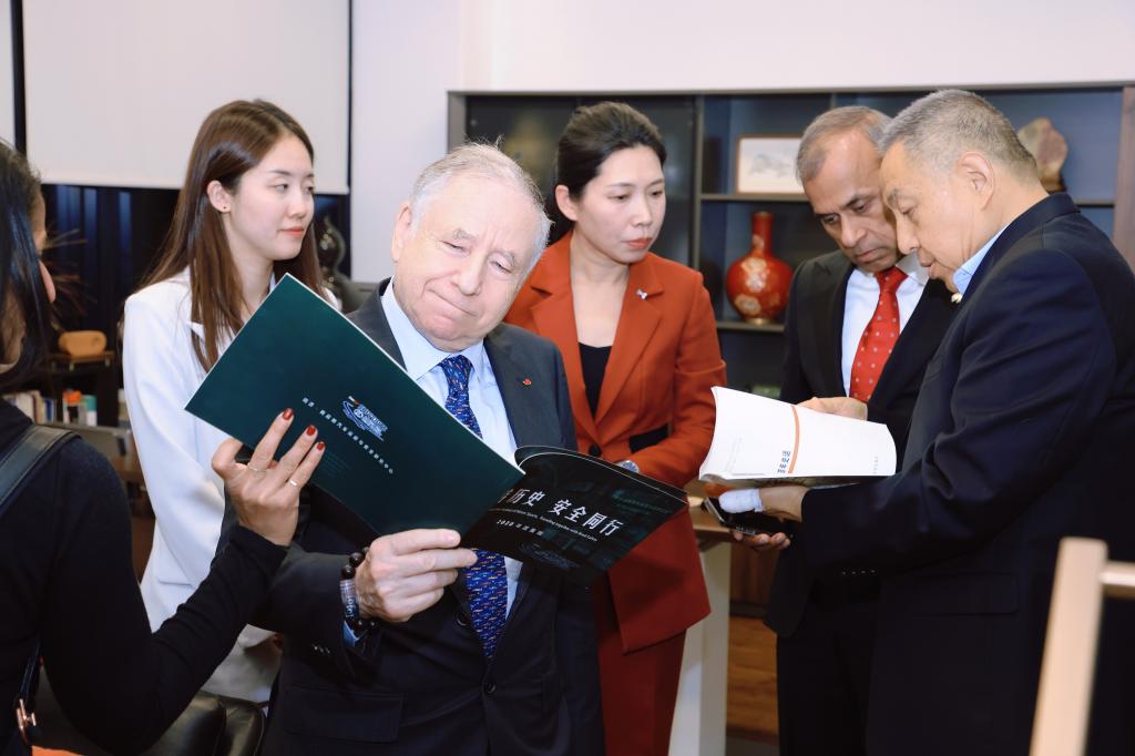 在汽車運動與安全研究中心30余米長的照片墻前,托德回憶起其擔任國際汽車聯合會主席以及在世界汽車運動領域中的難忘經歷。他在一張記錄著2005年姚啟明獲得賽道設計資格的照片前,感嘆中國賽道設計師與汽車運動共成長的20年。在參觀完汽車運動文化主題雕塑后,托德和常啟德詳細翻閱了中心汽車運動與道路安全系列公益科普集錦,姚啟明向常啟德贈送《汽車運動百年史話》科普圖書。