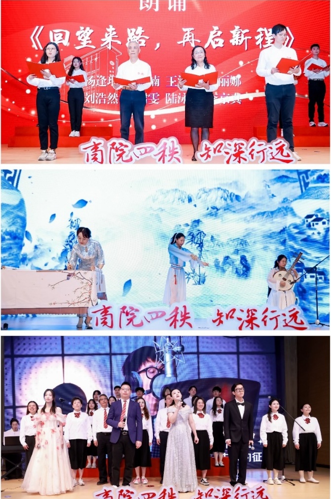會上,華東理工大學(xué)商學(xué)院師生共同表演了詩朗誦《回望來路,再啟新程》、古風(fēng)舞與現(xiàn)場作畫《青花瓷》、院慶原創(chuàng)歌曲合唱《商愿》等。