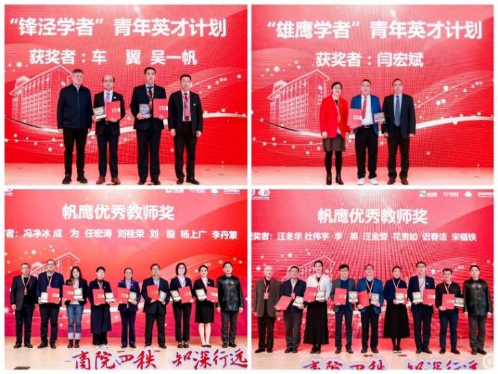 田禾院士與鋒涇(中國)建材集團有限公司副總裁李春為入選“鋒涇學(xué)者”青年英才計劃的教師車翼、吳一帆頒獎。華東理工大學(xué)原副校長吳柏鈞與廣東昊路建設(shè)有限公司總經(jīng)理王雄鷹為入選“雄鷹學(xué)者”青年英才計劃的教師閆宏斌頒獎。華東理工大學(xué)原工商經(jīng)濟學(xué)院常務(wù)副院長錢世超,華東理工大學(xué)商學(xué)院原分黨委副書記沈鐵群與無錫市帆鷹警用器材有限公司總經(jīng)理烏信梓為獲得“帆鷹優(yōu)秀教師獎”的14位教師頒獎。