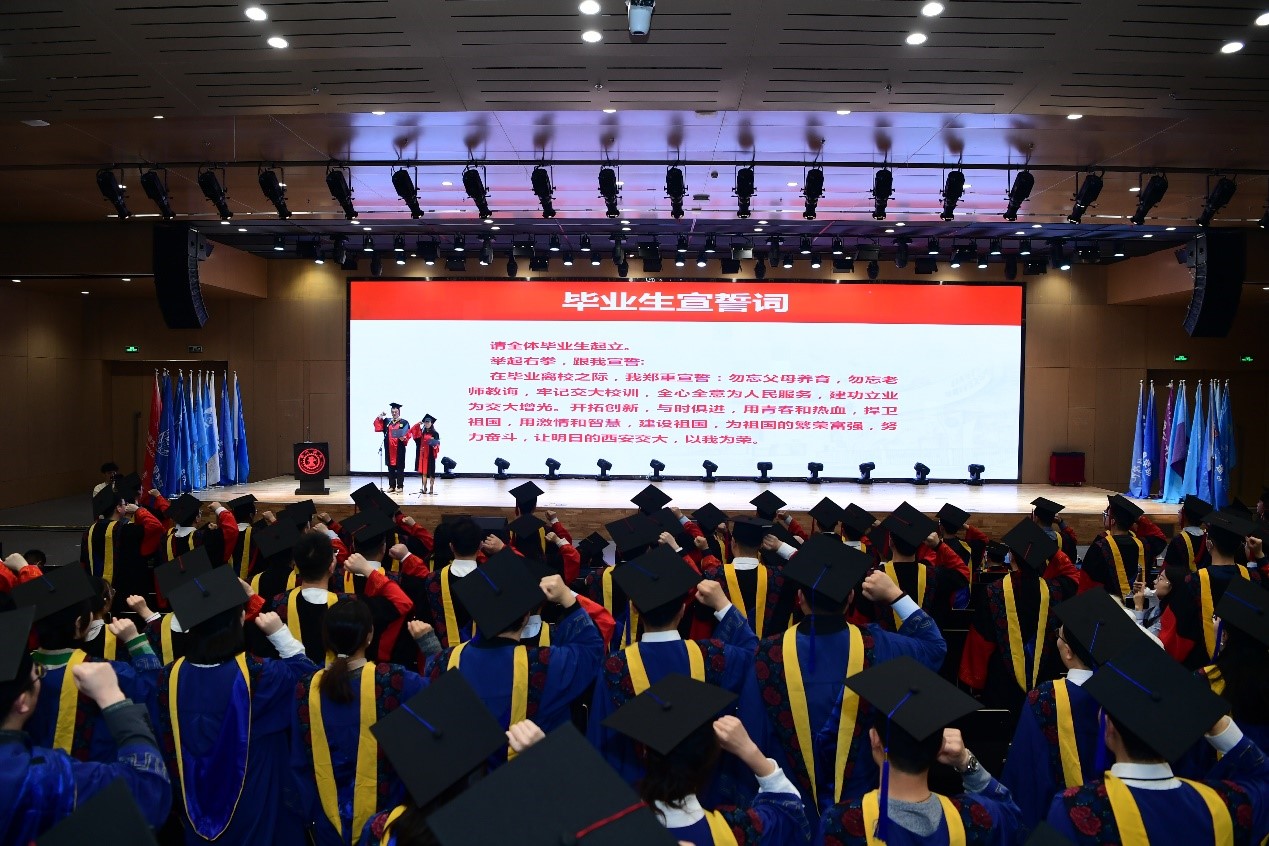 在電氣學院王子豐和材料學院賈豫婕同學的帶領下,全體畢業(yè)生舉起右拳,莊嚴宣誓:“用青春和熱血,捍衛(wèi)祖國;用激情和智慧,建設祖國;為祖國的繁榮富強,努力奮斗;讓明日的西安交大,以我為榮?!币蛔忠痪?、鏗鏘有力,這是畢業(yè)生對母校的鄭重承諾,也是他們?yōu)樽约杭磳㈤_始的新的人生征程許下的豪邁誓言。