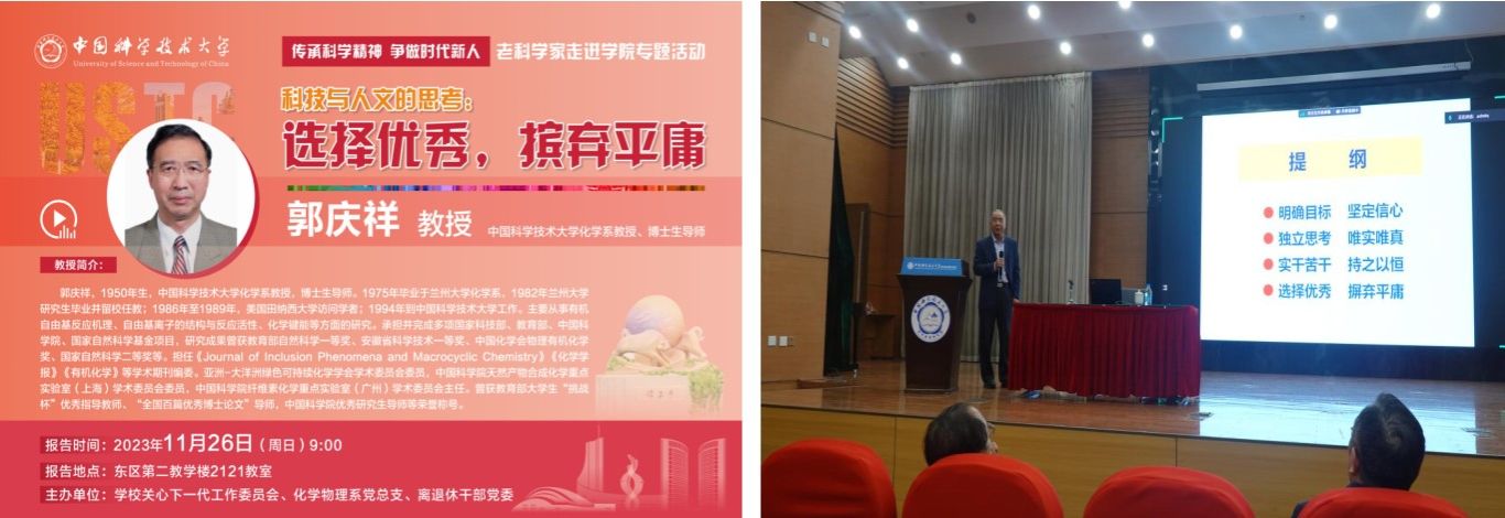 11月22日及26日,關(guān)工委成員郭慶祥教授受邀為蘇州高等研究院及化學(xué)院化學(xué)物理系師生作題為《科技與人文的思考:選擇優(yōu)秀,擯棄平庸》的專題報(bào)告,通過(guò)分享國(guó)內(nèi)外眾多科學(xué)家的真實(shí)案例,鼓勵(lì)和引導(dǎo)廣大師生樹(shù)立正確的價(jià)值理念和奮斗目標(biāo),循和運(yùn)用正確、科學(xué)的路徑和方法,傳承弘揚(yáng)“兩彈一星”精神和老一輩科學(xué)家精神,接續(xù)奮斗、勇于創(chuàng)新、力爭(zhēng)一流。