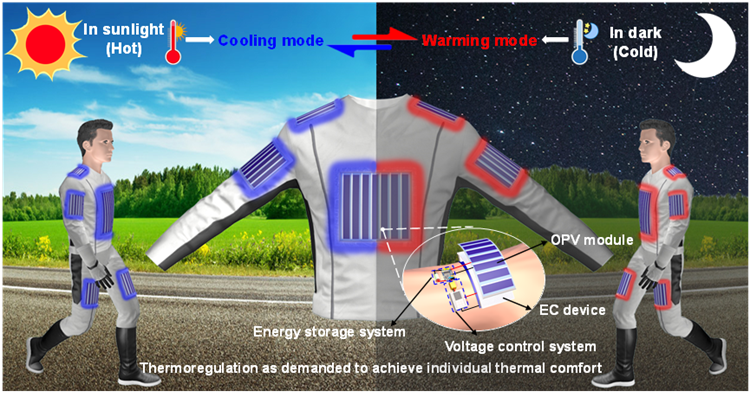 僅用太陽(yáng)光驅(qū)動(dòng)的全天候自持續(xù)人體熱管理衣物工作原理示意圖(該科研成果被《科學(xué)》雜志在線發(fā)表)