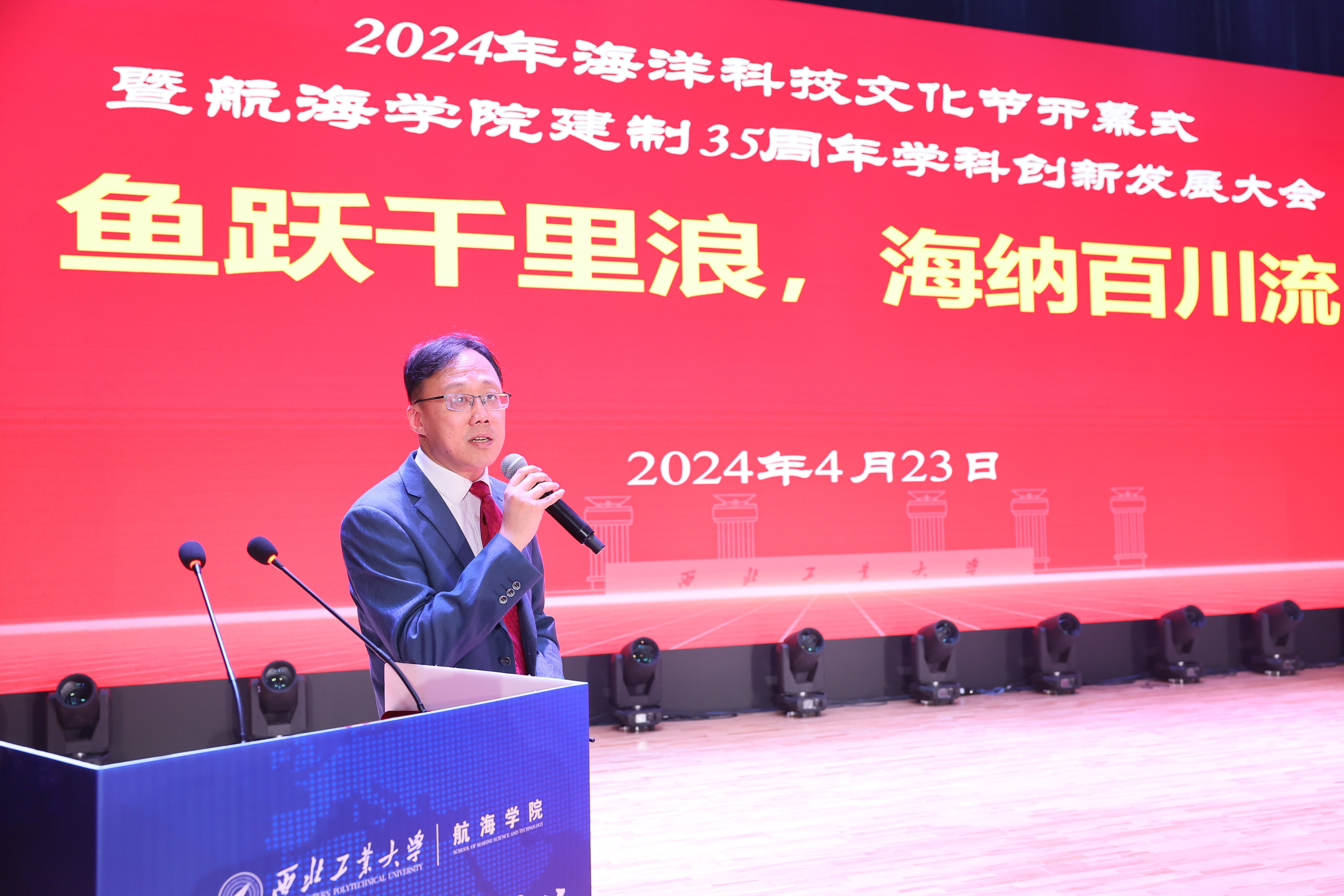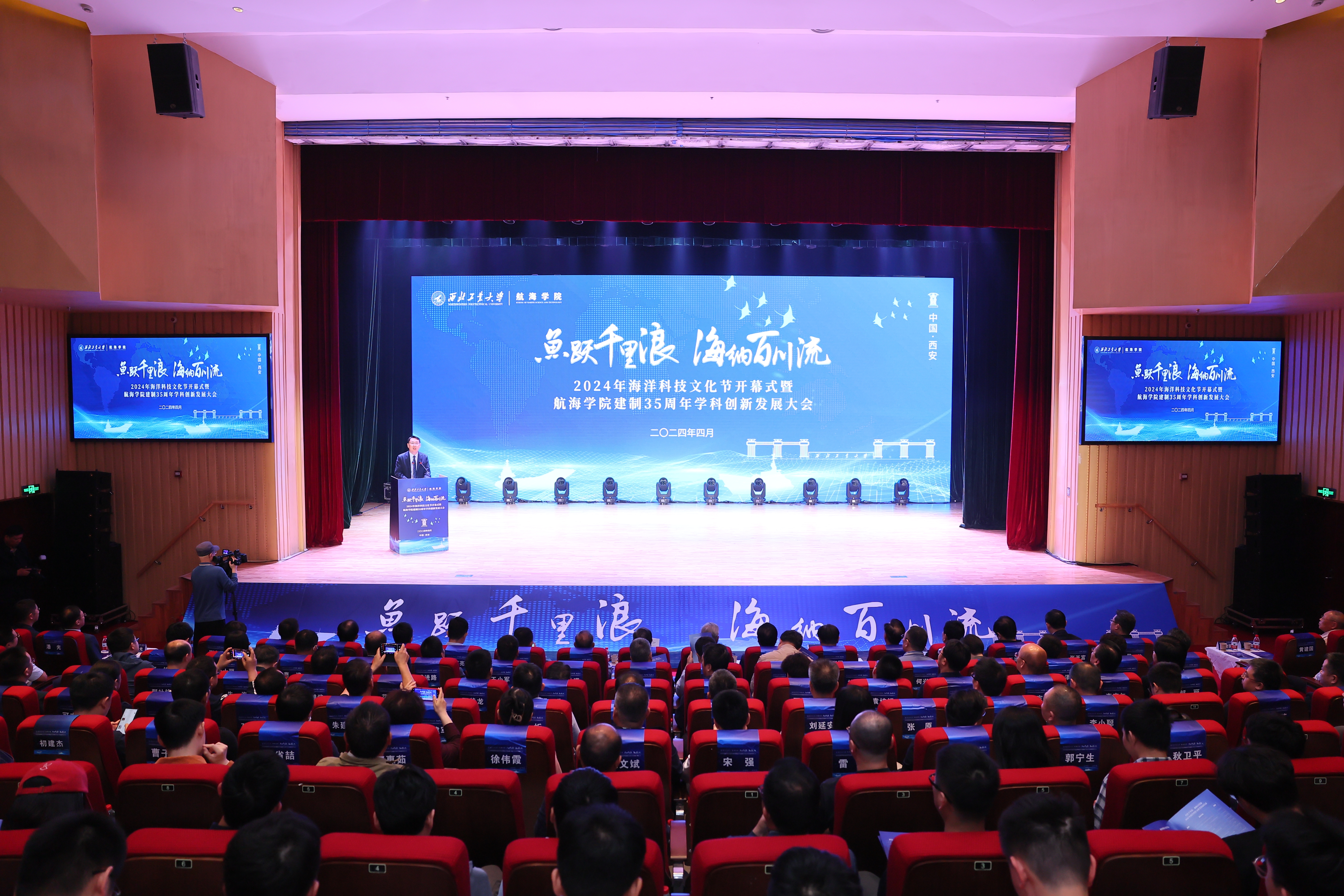 “魚躍千里浪 海納百川流”,恰逢我國第75個海軍節(jié),4月23日上午,我校2024年海洋科技文化節(jié)開幕式暨航海學院建制35周年學科創(chuàng)新發(fā)展大會在長安校區(qū)隆重舉行。中國工程院院士馬遠良、徐德民,西北工業(yè)大學校長、中國工程院院士宋保維,原黨委書記李保義,副校長楊益新、張開富,校友代表、中國造船學會副理事長劉鄭國,陜西省科技廳一級巡視員趙懷斌,中國船舶第705研究所黨委書記孫軍亮,山西平陽機械廠董事長聶秋社,中國兵器工業(yè)集團第204研究所所長魏衛(wèi),西安工程大學校長王海燕等來自國內(nèi)近百家行業(yè)院所、兄弟高校的主要領(lǐng)導、專家學者及學校各職能部門負責人,航海學院歷任老領(lǐng)導,老教師代表、校友代表和師生代表等共計300余人參加開幕式。開幕式由航海學院黨委書記劉朝亞主持。