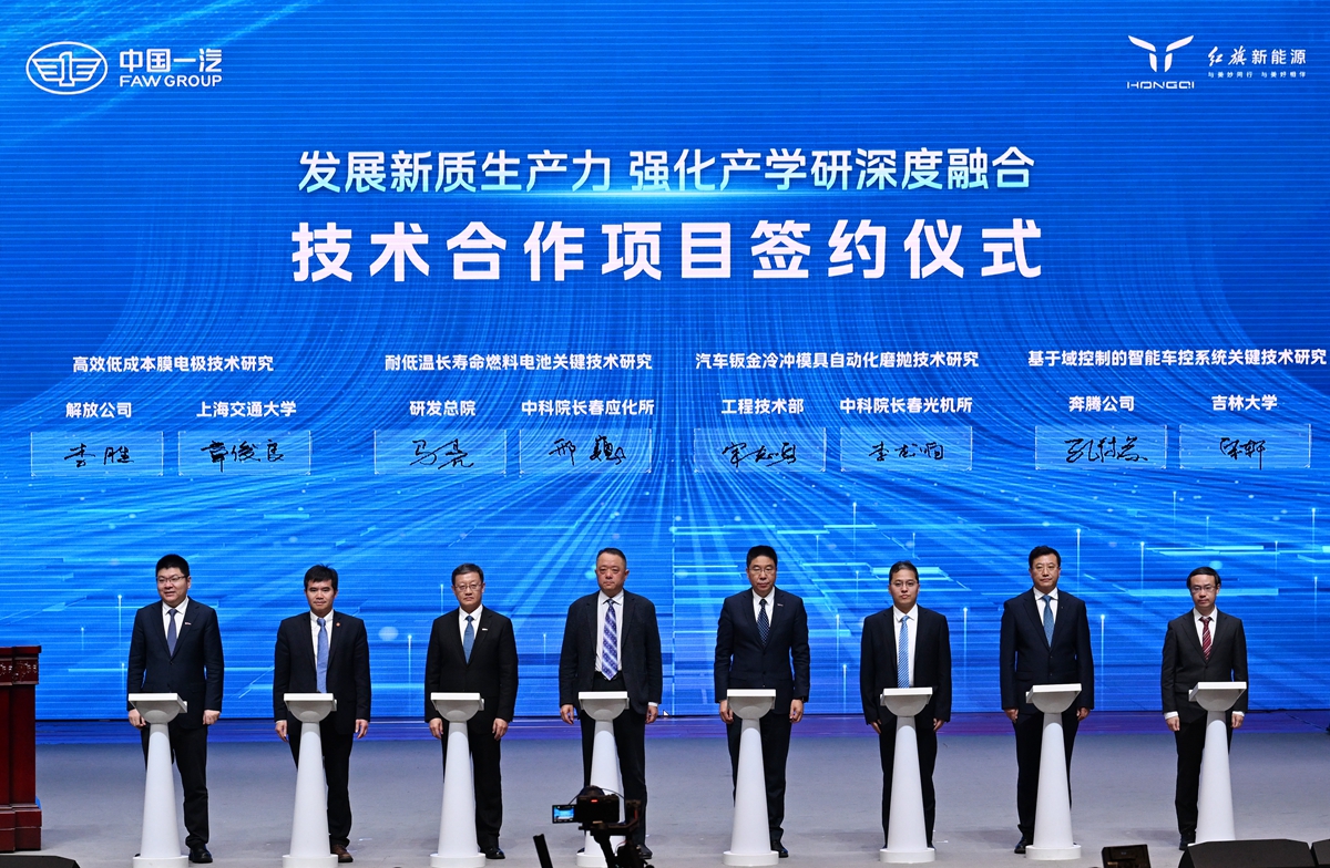 會前,姜治瑩同與會嘉賓參觀了中國一汽科技成果展,深入了解紅旗品牌、解放品牌在智能化、電動化、低碳化、智慧制造等多個技術(shù)領(lǐng)域的核心成果,并與企業(yè)科技人員交流。會上,吉林大學(xué)與中國一汽奔騰公司,圍繞“基于域控制的智能車控系統(tǒng)關(guān)鍵技術(shù)研究”進行了技術(shù)合作項目簽約,旨在充分發(fā)揮校企協(xié)同優(yōu)勢,探索成果轉(zhuǎn)化新路徑,發(fā)展新質(zhì)生產(chǎn)力,強化產(chǎn)學(xué)研深度融合。