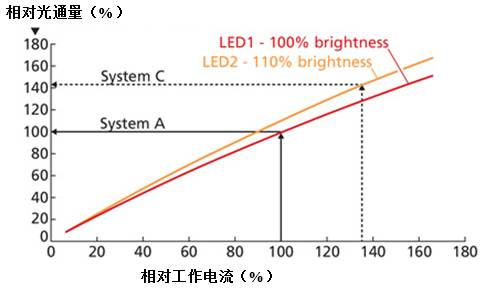 如果在系統(tǒng)層面不需要提高效率,也許是因為系統(tǒng)已經(jīng)達(dá)到能效等級的閾值,可以通過增加電流密度將效率從110%降低到100%。這意味著加上最初的10%之外,新系統(tǒng)C將會更加明亮,由于與系統(tǒng)A效率相同,亮度水平比系統(tǒng)A高42%。