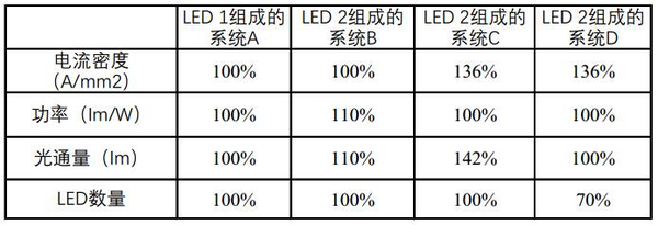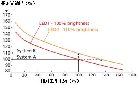 使用帶有LED 1的系統(tǒng)A作為參考。在正常工作電流為100%時,該系統(tǒng)的相對效率為100%,相對光通量值為100%。系統(tǒng)所需的LED的相對數(shù)量也是100%。