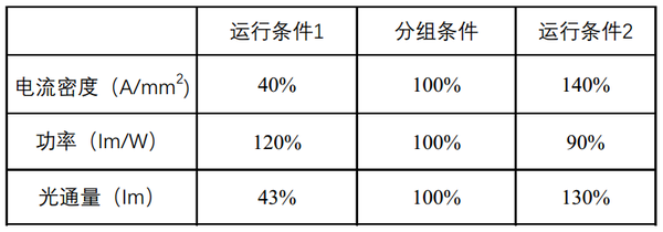 LED通常根據(jù)某一工作電流的亮度和顏色進(jìn)行分組。對于特定的分組條件,因此可以通過改變電流密度來調(diào)整適合于應(yīng)用和期望達(dá)到發(fā)光效能水平的效率。