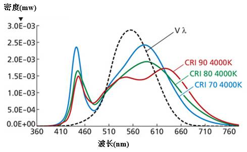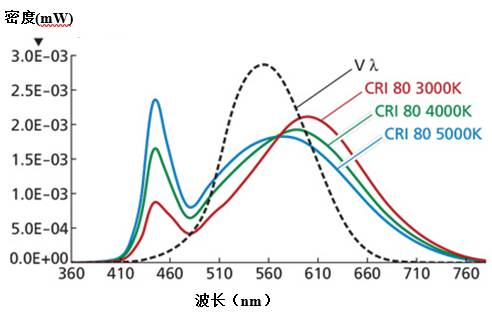 色溫低的(例如3000K)效率更高。圖1中的曲線圖顯示LED在顯色指數(shù)(CRI)Ra> 80的時候不同CCT值的光譜(或光譜功率分布 - SPD)。SPD曲線建立在人的靈敏度曲線Vλ上。