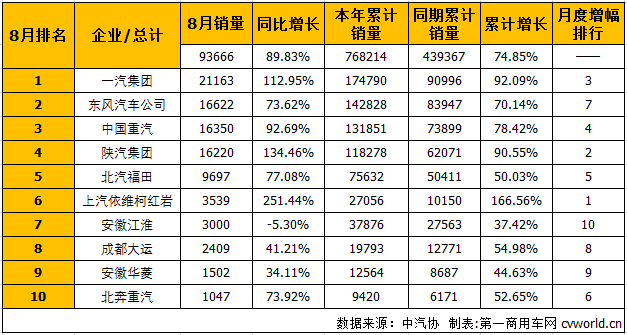 根據(jù)中汽協(xié)最新產(chǎn)銷快訊,2017年8月份,國(guó)內(nèi)重型卡車(含非完整車輛、半掛牽引車)銷售93666輛,環(huán)比增長(zhǎng)3.83%,同比大增89.83%。銷量排名前十的企業(yè)共計(jì)銷售91549輛,占據(jù)8月份整個(gè)重型卡車(含非完整車輛、半掛牽引車)市場(chǎng)總銷量97.74%的份額。8月份,重卡市場(chǎng)的好勢(shì)頭繼續(xù),4家企業(yè)銷量過萬(wàn)(與前三個(gè)月持平),一汽解放繼續(xù)破2萬(wàn)輛,達(dá)到了21163輛。銷量前十企業(yè)9增1降,僅排名第7位的安徽江淮下降5.30%;增長(zhǎng)的9家企業(yè)中增幅超過100%的有3家,增幅最高的則是上汽依維柯紅巖,達(dá)到了251.44%。