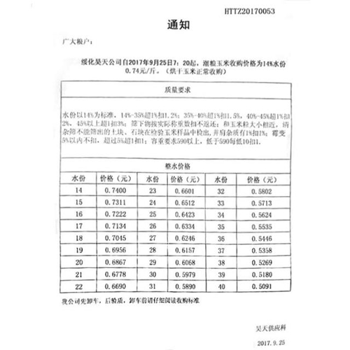 某公司的玉米收購?fù)ㄖ?,通知顯示,就在9月25日,該公司對黑龍江地區(qū)新玉米收購價格為0.74元,比去年翻倍。