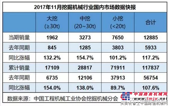 2017年11月,共計銷售各類挖掘機械產(chǎn)品13822臺,同比漲幅107.4%。國內(nèi)市場銷量(統(tǒng)計范疇不含港澳臺)12885臺,同比漲幅117.2%。出口銷量922臺,同比漲幅27.3%。
