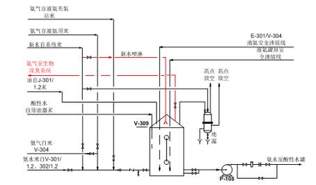 根據(jù)裝置實(shí)際運(yùn)行情況,進(jìn)行了如下改進(jìn)措施:①更換預(yù)處理除油器系統(tǒng)濾芯,以提高除油效果,降低除油器系統(tǒng)反沖洗頻次;②、將兩級(jí)結(jié)晶罐原有石棉保溫拆除,更換新保溫,以提高裝置關(guān)鍵參數(shù)結(jié)晶罐溫度的控制效果;③、在液氨進(jìn)成品液氨罐之前,增加液氨提純?cè)O(shè)施,以提高液氨質(zhì)量,減少液氨罐除油切雜頻次。④、優(yōu)化液氨充裝操作,將充裝時(shí)產(chǎn)生的氨氣由進(jìn)入氨水罐改輸送至氨蒸發(fā)器,依次進(jìn)入氨氣緩沖罐后,再進(jìn)入氨氣壓縮機(jī)循環(huán)處理。⑤、將氨水罐頂原有呼吸閥拆除,罐頂增加抽出管線至污水處理系統(tǒng)2000m3隔油池入口(圖3),將罐內(nèi)揮發(fā)溢出氣相引至臭氣集氣系統(tǒng),進(jìn)入除臭設(shè)施進(jìn)行處理。⑥、考慮到氨水罐現(xiàn)有水封罐無(wú)正負(fù)壓功能,在氨水罐罐頂增加超壓、負(fù)壓壓力平衡設(shè)施,以滿足超壓負(fù)壓條件下氨水罐安全運(yùn)行要求。⑦、氨水罐內(nèi)增加混合分布器、新水噴淋設(shè)施,消減氨介質(zhì)排放過(guò)程中罐體震動(dòng)和溶解虹吸防凍問(wèn)題,消除運(yùn)行安全隱患。