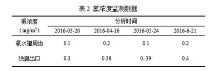 ②、將氨水罐內(nèi)氣相引入污水處理廠除臭系統(tǒng)進(jìn)行處理后,從實(shí)際運(yùn)行情況來(lái)看(表2),氨水罐周圍環(huán)境質(zhì)量實(shí)現(xiàn)大幅提升,為員工的生命安全提供了保障,產(chǎn)生的環(huán)保效益和社會(huì)效益顯著。