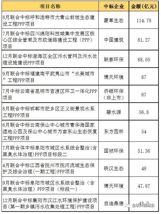 近幾年出現(xiàn)了很多環(huán)境綜合整治類的項目,體量非常大,規(guī)模甚至達(dá)到幾十億或上百億。盤點2017年環(huán)保PPP項目,按中標(biāo)金額排列前十大項目如下表: