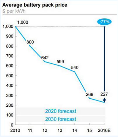 根據(jù)Mckinsey&Company(麥肯錫)的一份研究顯示:電池包的平均價格從2010年到2016年下降了高達77%,2016年平均價格大概在227美元/kWh左右,2030年平均價格將低于100美元/kWh(圖1)。而特斯拉宣稱其電池包價格在2016年上半年已經(jīng)小于190美元/kWh,低于Mckinsey&Company的227美元/kWh平均值。而特斯拉超級工廠的開業(yè)在2016年中旬,如此看來,貌似在超級工廠發(fā)揮作用之前,特斯拉的電池價格也已經(jīng)下降了很多。到底超級工廠還能為特斯拉后面的電池價格下降帶來多大的推動作用,還要拭目以待。