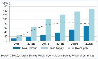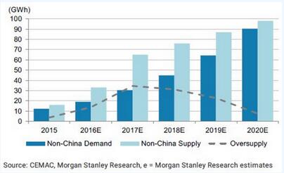 摩根斯坦利研究報告認(rèn)為:給特斯拉超級工廠帶來潛在風(fēng)險的主要是來自中國電池市場的挑戰(zhàn)。中國電動汽車市場的快速升溫使得中國本土電池制造商的電池價格在過去幾年下降了很多,并且這種下降趨勢還會繼續(xù)持續(xù)下去。此外,全球電池市場需求量已經(jīng)呈現(xiàn)供過于求的局面,尤其以中國市場最為顯著(圖2)。一方面這將驅(qū)使電池價格的進一步下降,另一方面,中國本土市場過剩的電池也會逐漸向外擴散銷往其他國家市場(圖3)。2017年動力電池的合同價格將可能達到150美元/kWh,而非工業(yè)界通常預(yù)期的200美元/kWh。因此,中國電池市場的發(fā)展?fàn)顩r,將直接影響特斯拉超級工廠的前途。