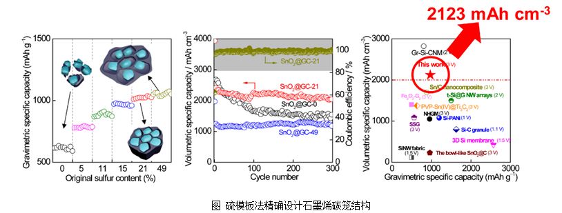 楊全紅教授研究團(tuán)隊(duì)聯(lián)合清華大學(xué)、國(guó)家納米中心和日本國(guó)立材料研究所的合作者在高體積能量密度鋰離子電池負(fù)極材料設(shè)計(jì)方面取得突破,基于石墨烯界面組裝,發(fā)明了對(duì)致密多孔碳籠精確定制的硫模板技術(shù)。他們?cè)诓捎妹?xì)蒸發(fā)技術(shù)構(gòu)建致密石墨烯網(wǎng)絡(luò)的過(guò)程中,引入硫作為一種可流動(dòng)的體積模板,為非碳活性顆粒完成了石墨烯碳外衣的定制。通過(guò)調(diào)制硫模板使用量,可以精確調(diào)控三維石墨烯碳籠結(jié)構(gòu),實(shí)現(xiàn)對(duì)非碳活性顆粒大小“合身”的包覆,從而在有效緩沖非碳活性顆粒嵌鋰巨大體積膨脹的基礎(chǔ)上,作為鋰離子電池負(fù)極表現(xiàn)出優(yōu)異的體積性能。
