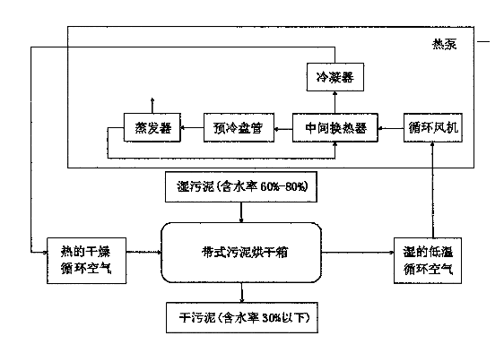 作為優(yōu)選,所述熱的干燥循環(huán)空氣的溫度為60-70℃,濕度在20%以下,經(jīng)帶式污泥烘干箱處理后進入熱泵的濕的低溫循環(huán)空氣溫度為50-60℃,濕度在50%以上。