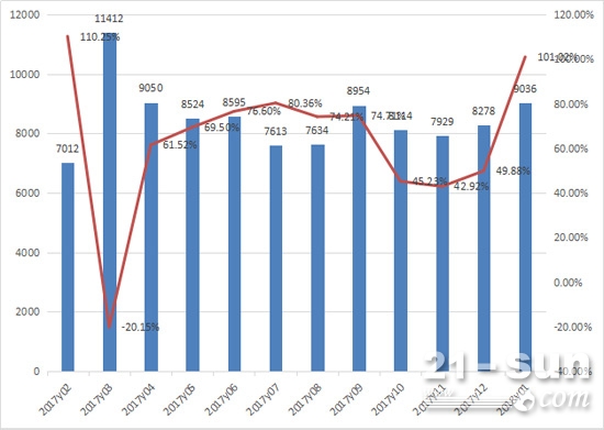 2018年1月份,納入統(tǒng)計的國內(nèi)25家主要裝載機生產(chǎn)企業(yè)合計銷售裝載機9036臺,同比去年1月份4495臺,增長101.02%,繼續(xù)保持快速上升勢頭。