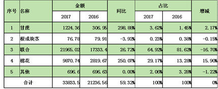 值得注意的是,根莖或塊莖和棉花收獲機(jī)出口量和出口額均出現(xiàn)不同程度的攀升,海關(guān)統(tǒng)計(jì)顯示,截至2017年11月底,進(jìn)口量分別為131臺(tái)和47臺(tái),同比分別增長(zhǎng)2.34%和291.67%;實(shí)現(xiàn)進(jìn)口額分別為1619.38萬美元和2194.02萬美元,同比分別大幅度攀升29.56%和280.43%。