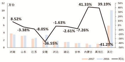 2017年收獲機(jī)區(qū)域市場(chǎng)呈現(xiàn)出兩個(gè)突出特點(diǎn),第一,區(qū)域集中度提高。銷售萬臺(tái)以上的區(qū)域共9個(gè),累計(jì)銷售各種聯(lián)合收獲機(jī)18.07萬臺(tái),同比小幅下滑4.39%;占比75.35%,較之2016年同期上揚(yáng)10.09個(gè)百分點(diǎn)。第二,冰火同爐,“3上5下”。在前9大區(qū)域市場(chǎng)中,僅有河南、內(nèi)蒙古、黑龍江3大市場(chǎng)出現(xiàn)大幅度攀升,分別銷售3.82萬臺(tái)、1.06萬臺(tái)、1.03萬臺(tái),同比分別增長(zhǎng)8.52%、41.33%和39.19%。占比分別為15.93%、4.42%和4.3%,同比上揚(yáng)3.78、1.83和1.74個(gè)百分點(diǎn)。其它主流區(qū)域呈現(xiàn)不同程度的下滑。山東市場(chǎng)2017年銷量雖在3萬臺(tái),但同比小幅下滑3.38%。安徽市場(chǎng)出現(xiàn)“跳水”,銷售2.17萬臺(tái),同比大幅度下滑36.55%。