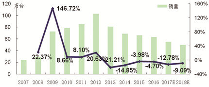 2007~2016年收獲機(jī)械銷售走勢(shì)與2017年2018年市場(chǎng)預(yù)測(cè)