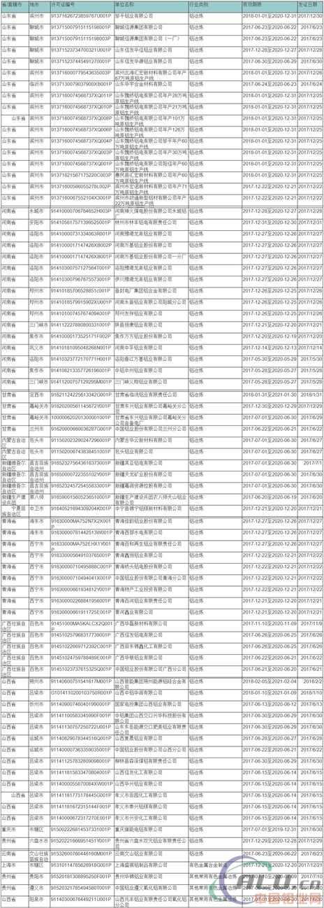 全國鋁冶煉行業(yè)獲得排污許可證的企業(yè)名單