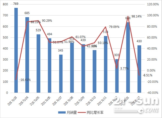 2017年3月至2018年2月推土機(jī)月銷量及同比增長(zhǎng)情況
