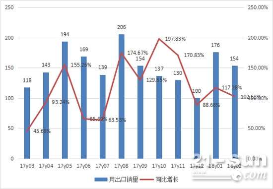 2017年3月至2018年2月推土機(jī)月出口銷量情況