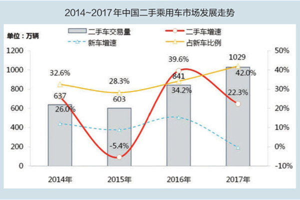 在內(nèi)外雙重因素的綜合作用下,2017年我國二手車交易量同比增長22.3%,達(dá)到1029萬輛,創(chuàng)歷史新高,相對于新車下滑0.3%的表現(xiàn),市場活躍度極高。但也應(yīng)注意到,受小排量新車購置稅由5%上調(diào)至7.5%帶來的市場增速下滑、車輛置換需求疲軟,以及2016年市場交易高基數(shù)的雙重影響,2017年二手車市場增速較2016年回落17.3個百分點。放眼未來,隨著新車市場的逐漸穩(wěn)定以及二手車市場規(guī)模突破千萬輛,二手乘用車將告別年同比40%左右的爆發(fā)式增長階段,進(jìn)入年同比增速20%左右的穩(wěn)增長階段。