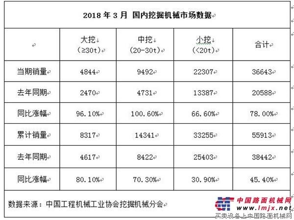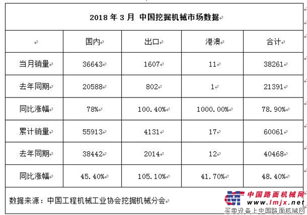 根據(jù)中國工程機械工業(yè)協(xié)會挖掘機械分會行業(yè)統(tǒng)計數(shù)據(jù),2018年1—3月納入統(tǒng)計的25家主機制造企業(yè),共計銷售各類挖掘機械產(chǎn)品60061臺,同比漲幅48.4%。國內(nèi)市場銷量(統(tǒng)計范疇不含港澳臺)55913臺,同比漲幅45.4%。出口銷量4131臺,同比漲幅105.1%。